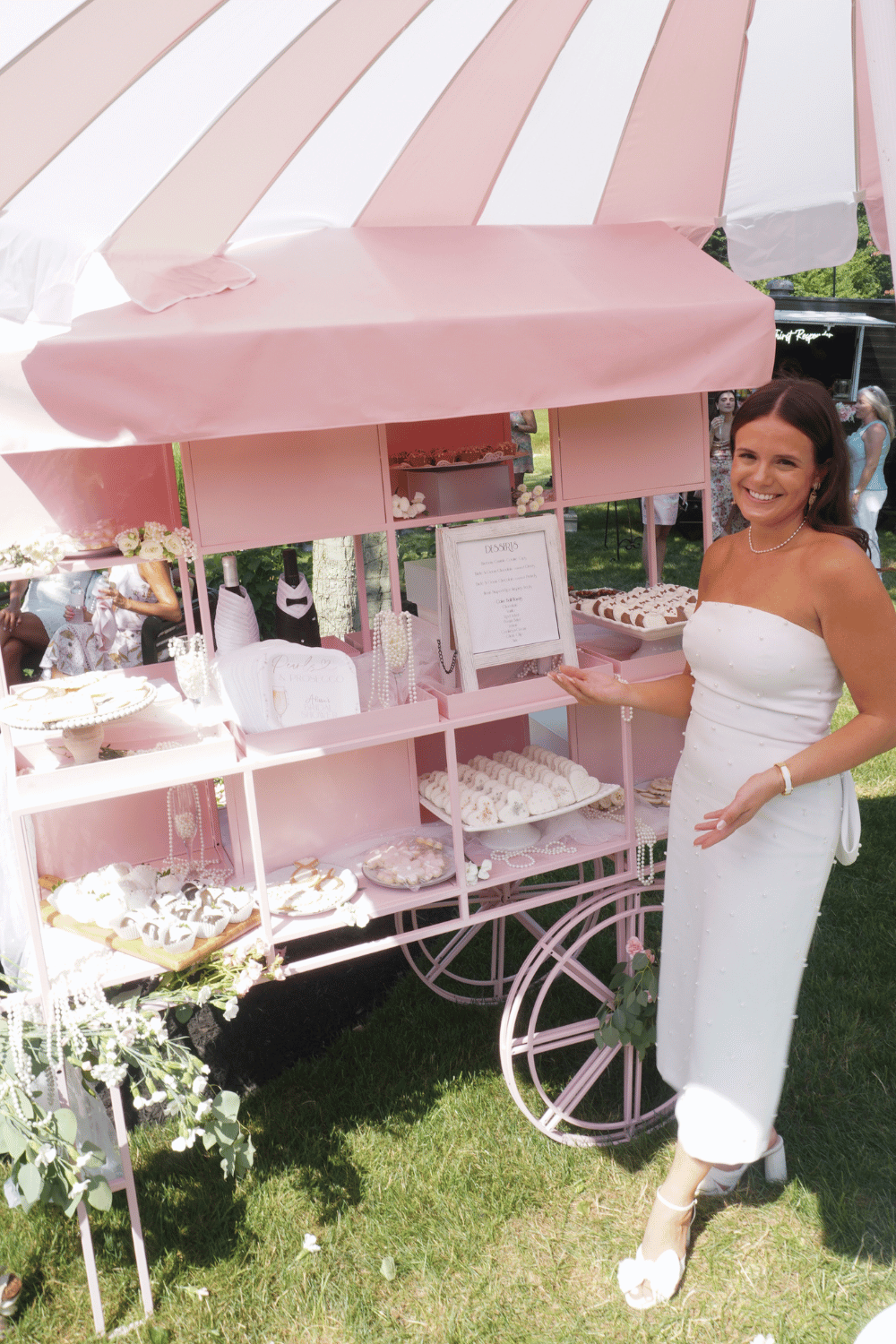 A beautifully styled themed bridal shower featuring a blush pink dessert cart filled with elegant sweets and décor. The bride stands beside the display, showcasing a creative and personalized celebration that blends traditional charm with modern, feminine design—perfect inspiration for a thoughtfully themed Cleveland bridal shower.